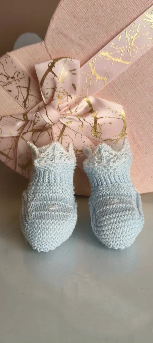 Preciosos patucos de bebé hechos a mano, perfectos para mantener los pies calentitos. Son de un suave color azul y tienen un diseño delicado.