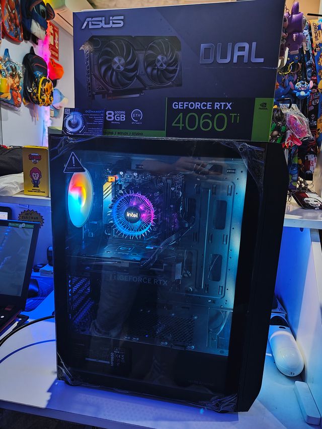 Detalles del productoPotente PC gaming con procesador i9 y tarjeta gráfica RTX 4060 Ti.