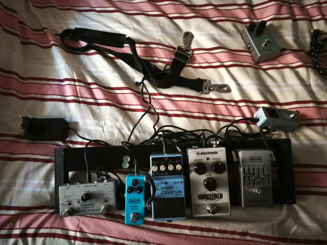 Detalles del productoPedalboard de efectos para guitarra con varios pedales.
