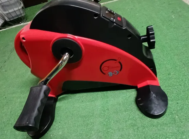 Detalles del productoPedaleador compacto en color rojo y negro, ideal para ejercitar piernas y brazos.