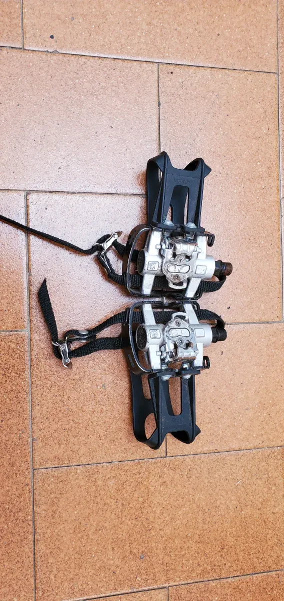 Par de pedales automáticos para bicicleta en buen estado. - Mecanismo de enganche SPD. - Incluye correas ajustables.