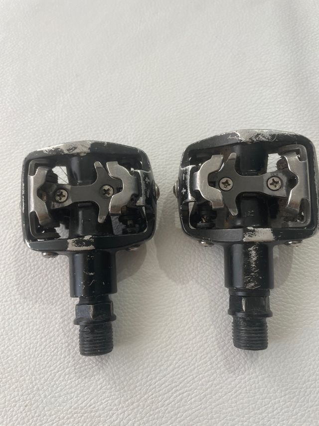 Par de pedales automáticos para bicicleta de montaña. - Diseño robusto en color negro. - Mecanismo de enganche para calas.