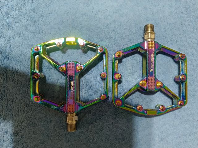 Detalles del productoPedales de bicicleta de aluminio West Biking, ¡ideales para tus rutas! Son dos pedales con un diseño hexagonal y un llamativo acabado multicolor iridiscente.