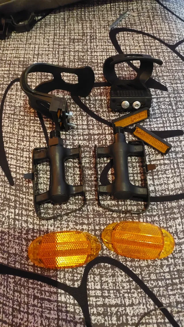 Set de pedales para bicicleta, listos para instalar. Incluye reflectores naranjas para mayor visibilidad. - Dos pedales negros. - Dos reflectores naranjas. -