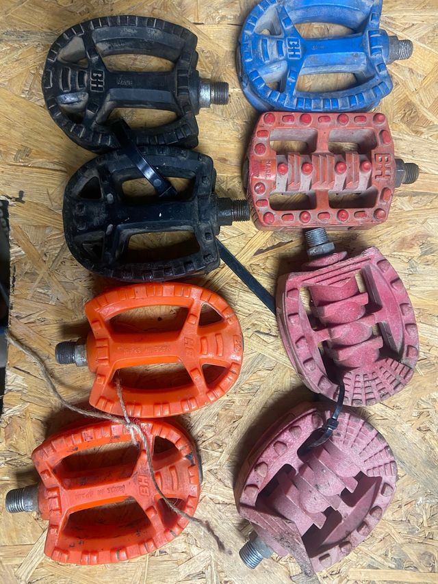 Detalles del productoSe venden ocho pedales de BMX Están usados y presentan señales de desgaste, como arañazos y suciedad. - Incluyen 8 pedales. naranjas y rojos parejas los demas desparejados