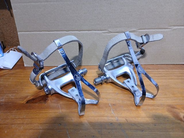 Pedales clásicos de bicicleta Campagnolo Athena. - Diseño plateado brillante. - Incluyen correas de cuero. - Ideales para bicicletas vintage.