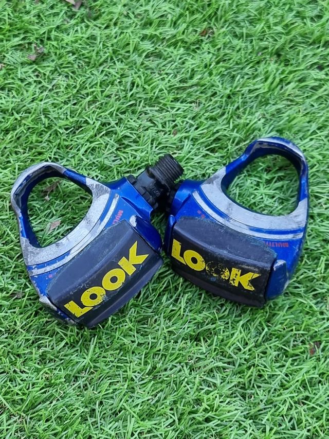Par de pedales de carretera de la marca Look en color azul. Funcionando correctamente. Marcas estéticas del uso y la edad.