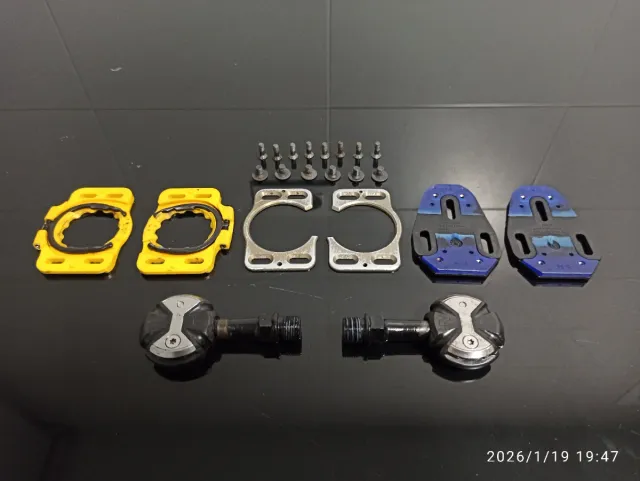 Detalles del productoSet de pedales de ciclismo Speedplay con sus correspondientes calas y tornillería.