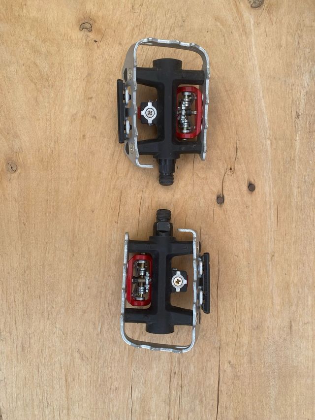 Detalles del productoPar de pedales para bicicleta con detalles en rojo.