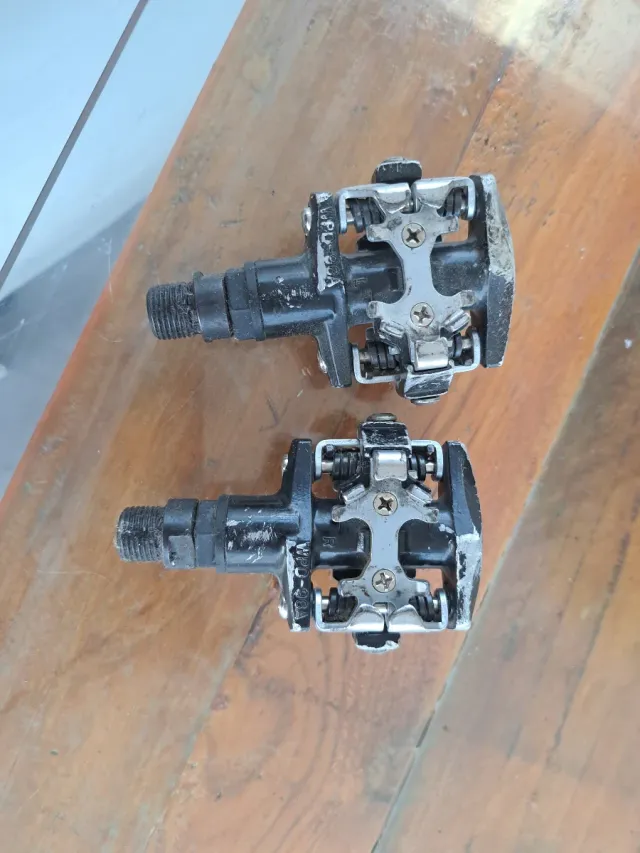 Par de pedales para bicicleta de montaña. - Color negro y plateado. - Mecanismo de anclaje para calas. Funcionan perfectamente rayados por meterme en campo carril vía verde con ramas etc.