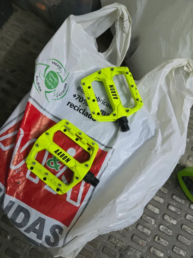 Par de pedales para bicicleta de montaña marca Aaron. - Color amarillo neón. - Diseño plano con pines.