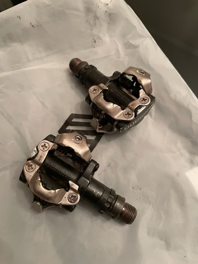 Detalles del productoPedales Shimano para bicicleta de montaña (MTB) con sus correspondientes calas.
