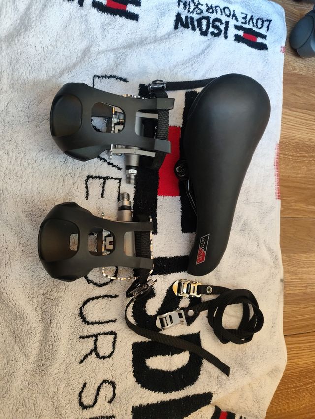 Conjunto de pedales y sillín para bicicleta de spinning. - Pedales con correas ajustables. - Sillín negro de la marca Endzone.