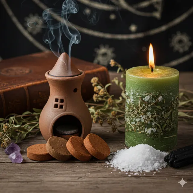 Kit esotérico. Sahumerio de la casa con pastillas y vela herborea de ruda y sal