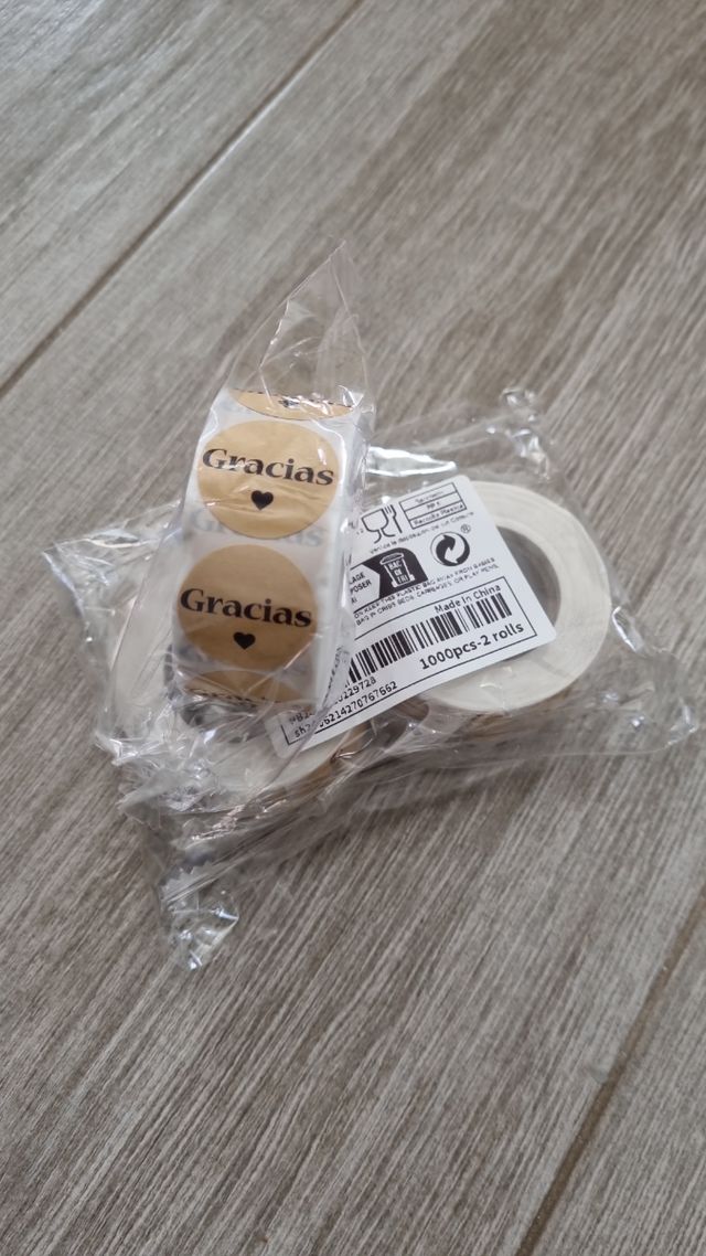 Detalles del productoEtiquetas adhesivas de agradecimiento. Son 1500 pegatinas en total, distribuidas en dos rollos. Están nuevas y vienen en un paquete de plástico. - Diseño minimalista con un corazón. - Ideales para negocios o uso personal. - Mensaje "Gracias" en español.