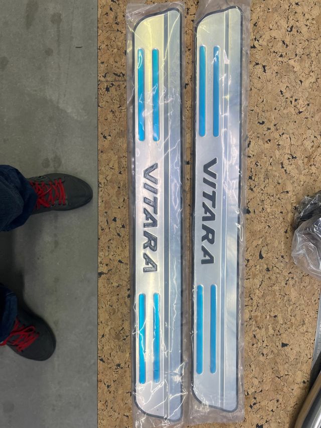 Set de peldaños para Suzuki Vitara. Fabricados en metal con detalles en azul. - Diseño moderno y resistente. - Logos de Vitara grabados.