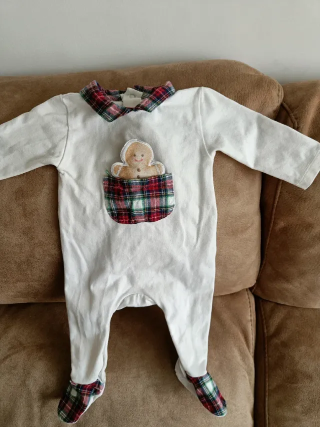 Detalles del productoPelele blanco para bebé con estampado de galleta de jengibre y detalles a cuadros.