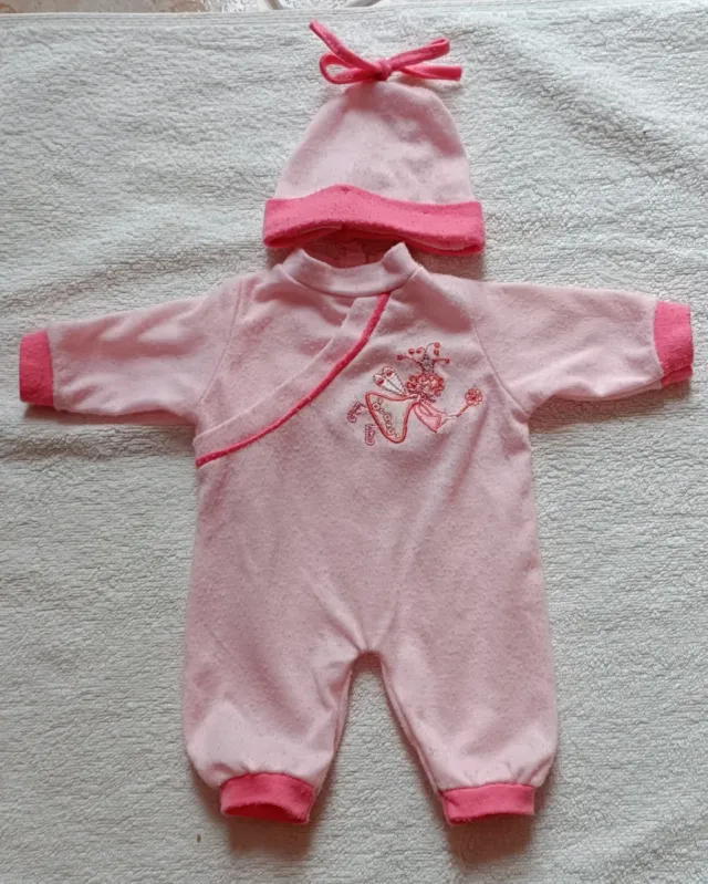 Conjunto de pelele y gorro para muñeca Nenuco. - Color rosa. - Detalle bordado en el pecho. - Gorro con lazo. - Puños y cuello en contraste. Gastos a parte.