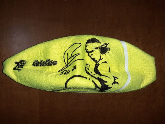 Detalles del productoPelota de tenis gigante con la imagen y la firma de Rafa Nadal (Expo Zaragoza 2008). Tiene la misma textura que cualquier pelota de tenis convencional. Promoción de Cola Cao.