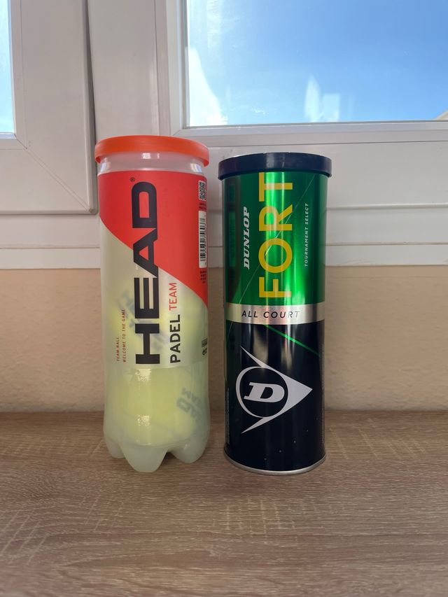 Dos botes de pelotas de pádel, una marca HEAD y otra DUNLOP. - Bote HEAD Padel Team. - Bote DUNLOP FORT All Court.