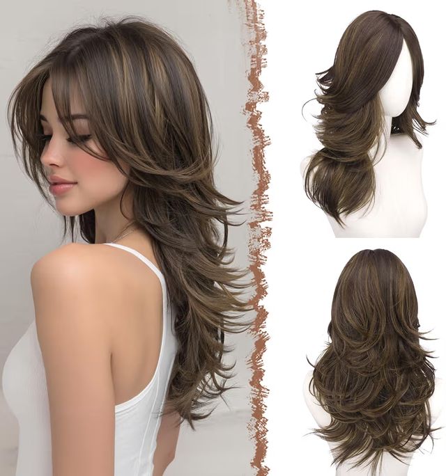 Peluca Larga Ondulada Castaña Reflejos