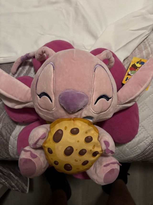 Adorable peluche de Angel, el personaje de Disney. - Color rosa. - Incluye una galleta. - Material suave y tierno.