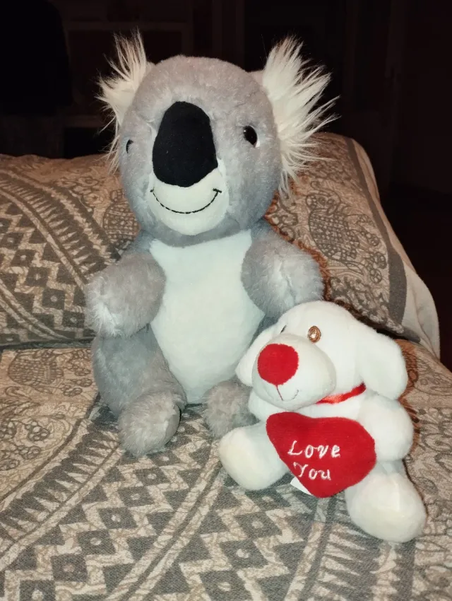 Detalles del productoSet de dos peluches adorables, un koala gris y un perro blanco con un corazón rojo.