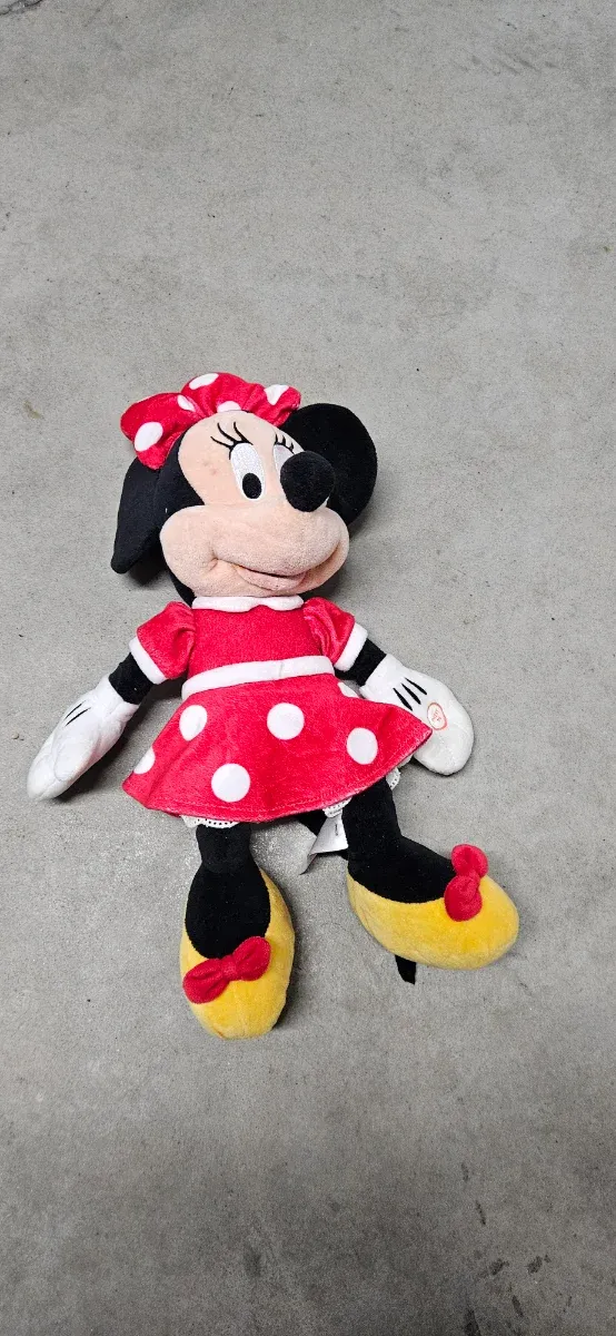 Peluche de Minnie Mouse con su icónico vestido. - Vestido rojo con lunares blancos. - Lazo rojo en la cabeza. - Zapatos amarillos.