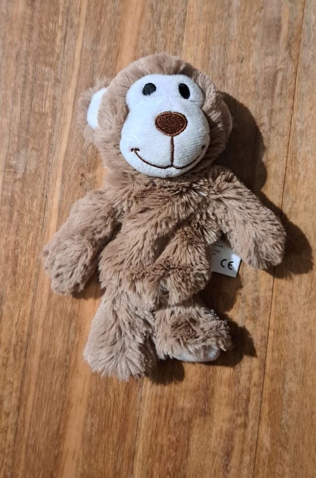 Adorable peluche de mono con un tacto muy suave (12cm) . Para niños o mascotas, hace ruido al apretarle la tripa. En perfecto estado sin uso.
