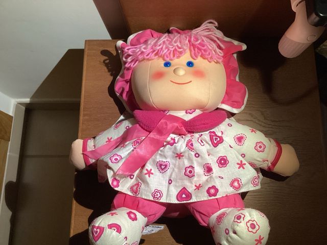 Adorable peluche de muñeca con detalles en rosa y estampado de flores. - Pelo rizado rosa. - Vestido blanco con flores rosas y corazones. - Lazos rosas decorativos.