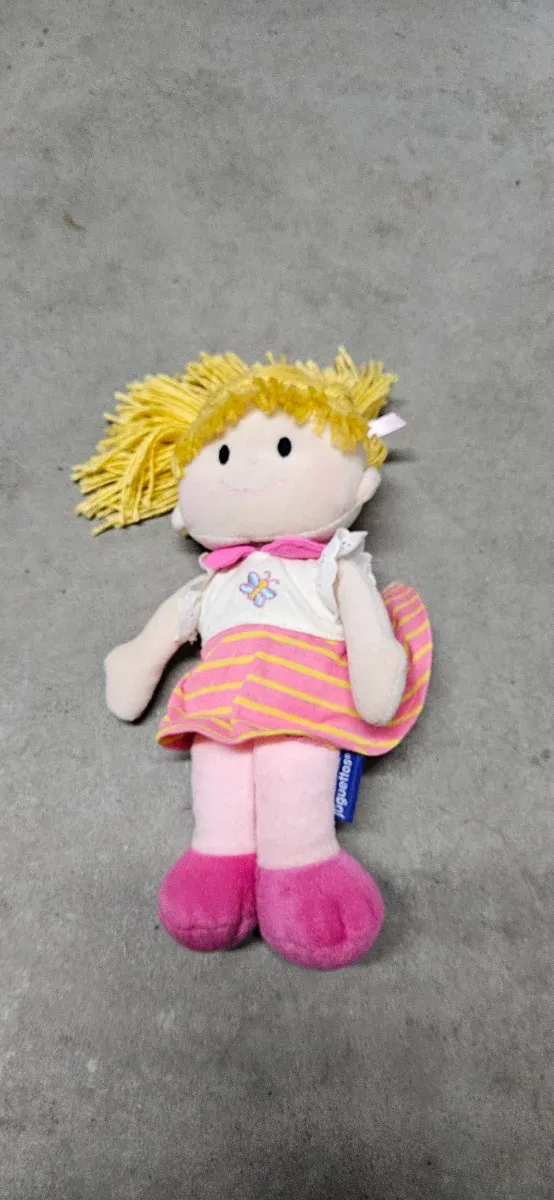 Adorable peluche de muñeca con pelo rubio y vestido a rayas. - Vestido blanco con detalles rosas y amarillos. - Zapatos rosas. - Lazo rosa en el cuello.