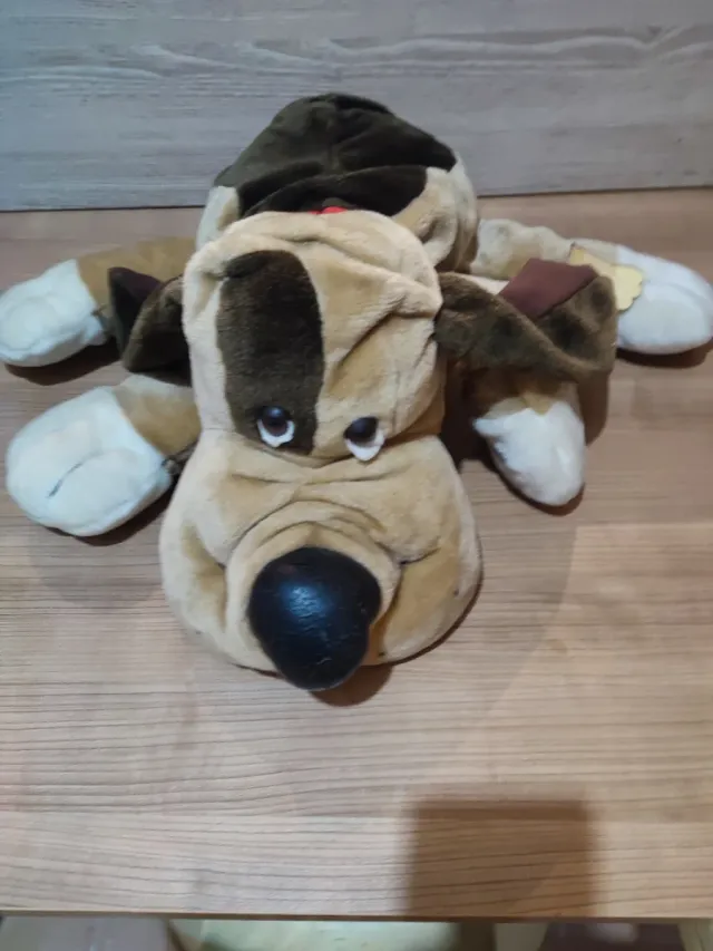 Peluche de perro con un diseño tierno y suave. - Color principal marrón y beige. - Orejas largas y caídas. - Nariz negra y brillante.