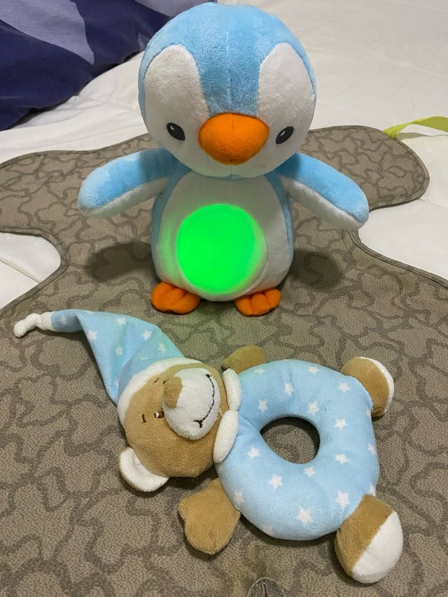 Detalles del productoPeluche de pingüino suave y musical para bebés. El pingüino tiene una luces en su barriga y musica.
