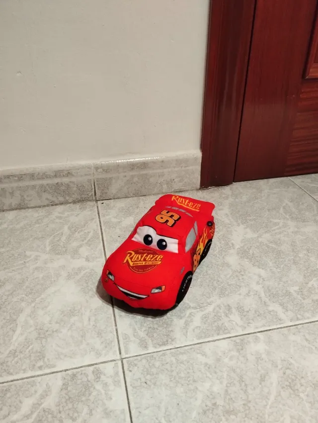 Peluche del personaje Rayo McQueen de Cars. - Color rojo. - Diseño de coche. - Detalles del personaje.