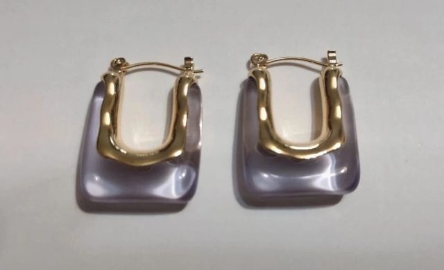 Pendientes semitransparentes en dorado y lila. 3 cm de largo. Nuevos. Se entregan con bolsa de regalo.