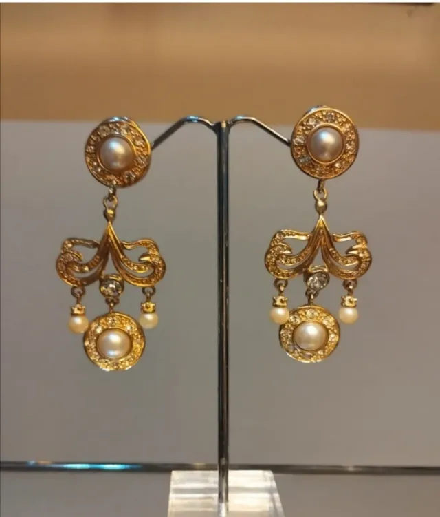 Pendientes Vintage estilo Barroco, bañados en oro 18k. Diseño con incrustaciones de perlas y circonitas. Cierre Omega. En perfecto estado, conservan su color y brillo