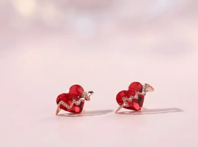 Elegantes pendientes con forma de corazón en un vibrante color rojo, adornados con un diseño de pulso plateado.