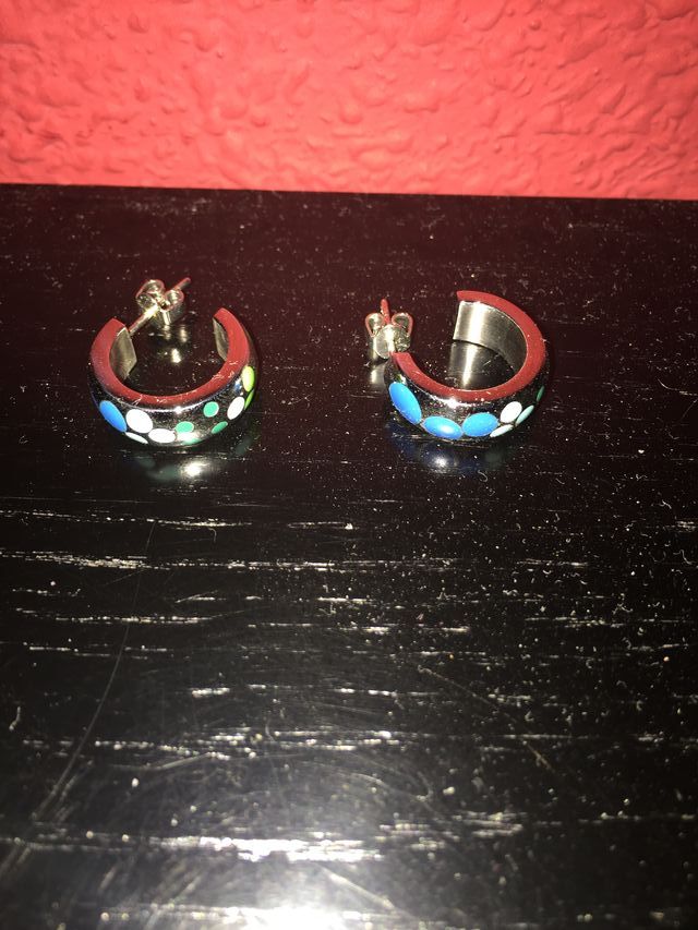 Pendientes de acero semi círculos. Con dibujos en azul y verde. Cierre de tuerca. Sin estrenar.