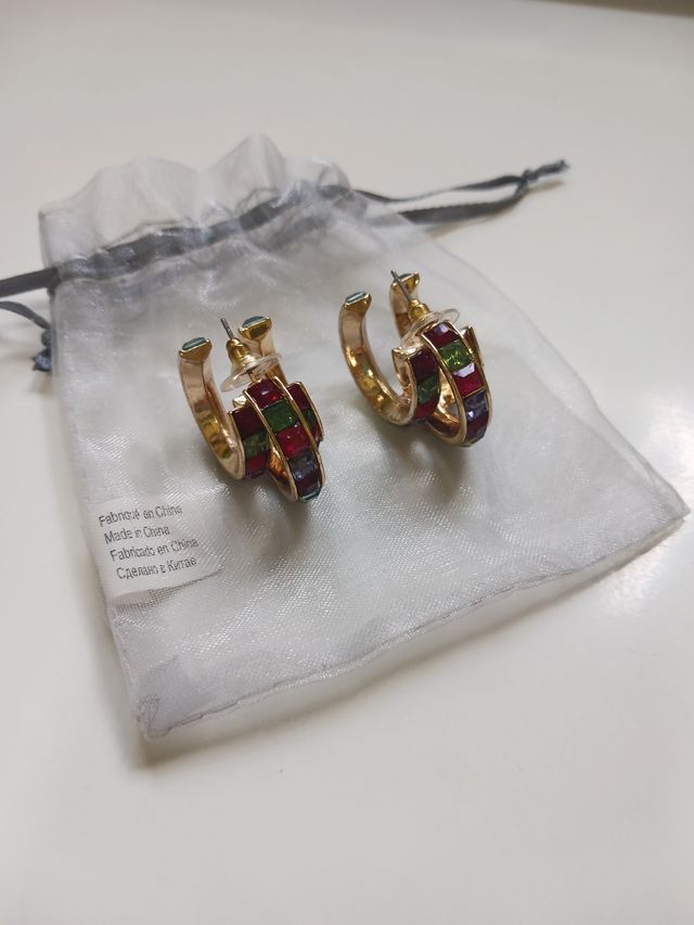Pendientes dorados de tres aros en uno con pedreria de varios colores.Con bolsita de regalo.Mango colección 2022.