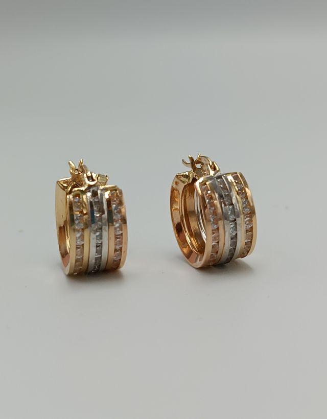 Detalles del productoPendientes de oro de 18kt y circonitas. Tres oros. Peso 3'96gr. Joyería Zimt & Pfeffer Viladecans, dirección calle Mare de Deu de Montserrat 19 Viladecans. Teléfono WhatsApp 644037784. Sem. 35/25.
