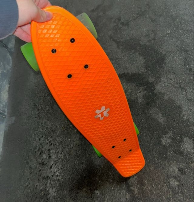 Monopatín tipo Penny de color naranja brillante. Las ruedas son de un llamativo color verde. - Tabla con textura antideslizante. - Logo central plateado.