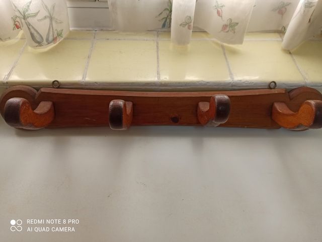 Percha muy antigua de madera totalmente artesanal. Medidas: 65×9 cms. 4 ganchos. Tiene algún arañazo debido a su antigüedad.