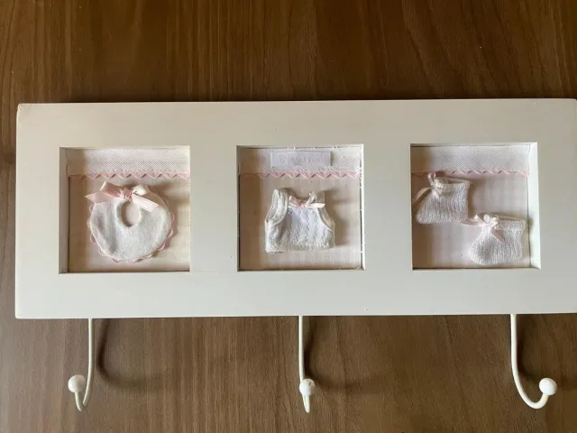 Detalles del productoPercha decorativa para habitación infantil de la marca Pasito a Pasito. Presenta un diseño con tres marcos que exhiben un babero, un conjunto de ropa y unos patucos, todos en tonos blancos y rosas, con detalles de lazos.
