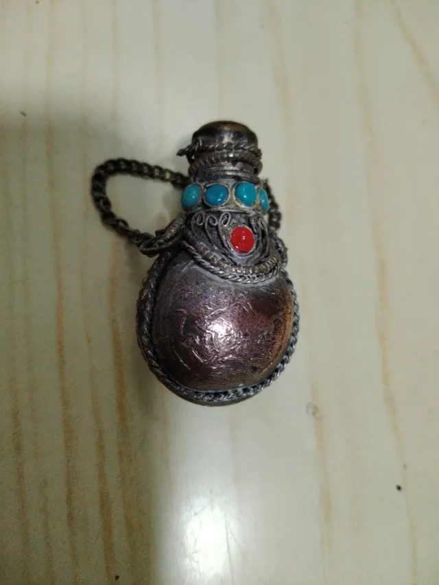 Pequeño y decorativo perfumero de alpaca. - Diseño con incrustaciones de piedras turquesas y una roja. - Cadena para colgar. - Detalles grabados en el cuerpo.