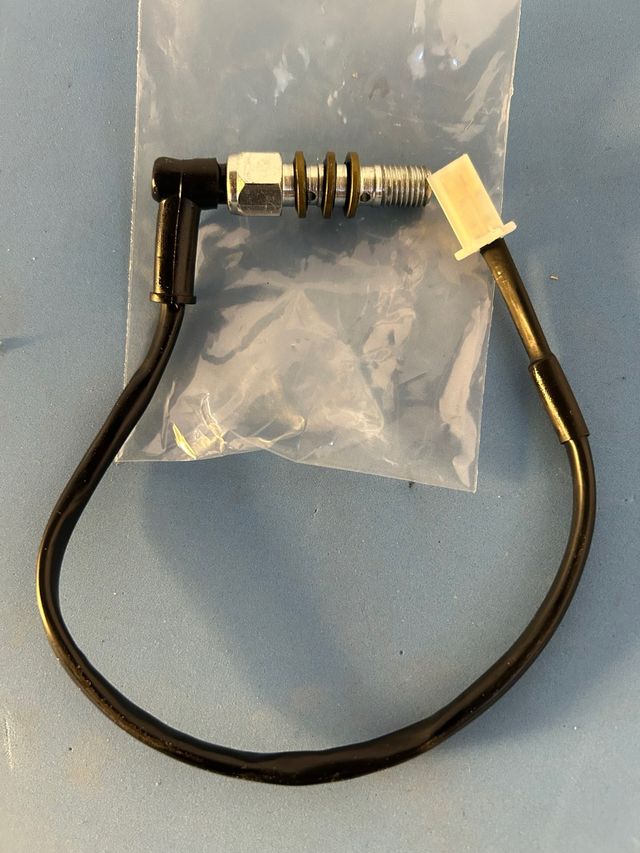 Perno/racor/tornillo doble para bomba de freno de moto con sensor para la luz de freno. M10x1.25 mm - Material metálico. - Conector eléctrico. - 90 grados