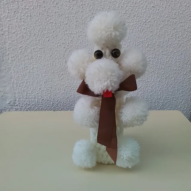 Figura decorativa de un perro caniche hecho a mano con ganchillo. Mide 29cm de altura. Tengo dos unidades. - Color blanco. - Detalle de lazo marrón y rojo.