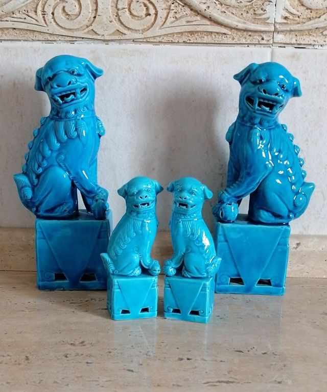 Detalles del productoLote de cuatro figuras de porcelana azul turquesa de leones Foo, también llamados guardianes celestiales. La leona hembra apoya su pata sobre un cachorro, tiene relación con la crianza, te protegerá a ti y los tuyos. El macho apoya su pata sobre una esfera, conocida como la flor de la vida y protegerá todo lo externo. Los más grandes miden 24 cms alto. Los más pequeños 12 cms. Están sellados y están en perfecto estado.