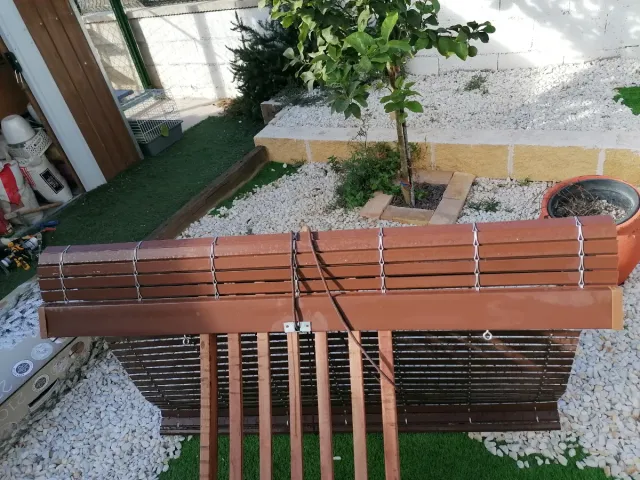 Detalles del productoPersiana enrollable de PVC en color marrón, ideal para exteriores. Su diseño imita la madera y es resistente a la intemperie. 120ancho x 100altura. Precio por unidad. Tengo 2