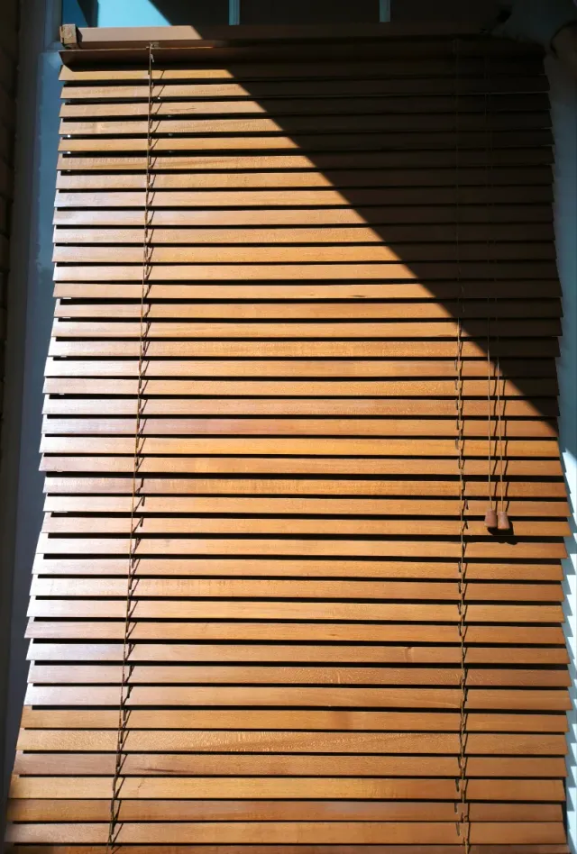 Persiana de lamas ajustables de madera que se controlan mediante un sistema de cordeles.
