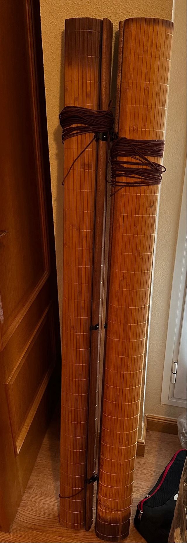 2 Persianas de bambú, color marrón está en buen estado, tiene un lado con menos color por el sol tengo dos 1.50x200